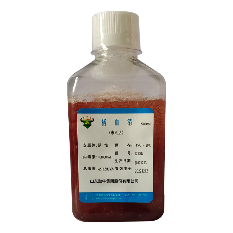 豬血清:系采用健康豬血液為原料,經(jīng)采集、分離、多級(jí)微孔濾膜過(guò)濾除菌和適宜劑量60Co照射。本產(chǎn)品無(wú)支原體、病毒和細(xì)菌, 內(nèi)毒素小于10EU/ml。適用于豬肺炎支原體等多種微生物的培養(yǎng)。